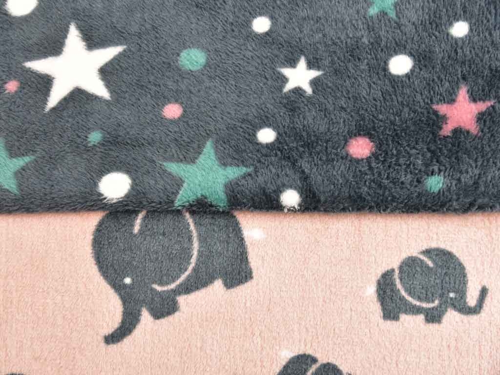Ein super weicher Doubleface Wellnessfleece in altrosa mit dunkelgrauen Elefanten. Die dunkelgraue Rückseite ist genauso kuschelig und hat ein Muster aus Sternen und Punkten in grün, weiß und altrosa.