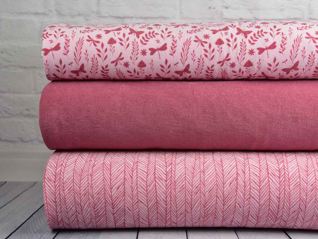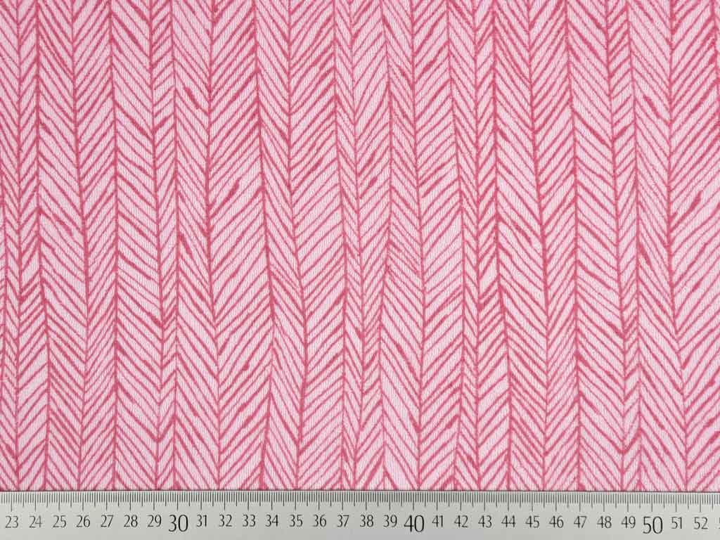 Ein elastischer, rosa Frotteestoff (Sweat) mit einem altrosa Fischgrätmuster. Er ist superbequem, weil er elastisch und kuschelig weich ist. Die Oberseite weist die typischen regelmäßigen Schlaufen auf, die Unterseite gleicht einem Sweatstoff.