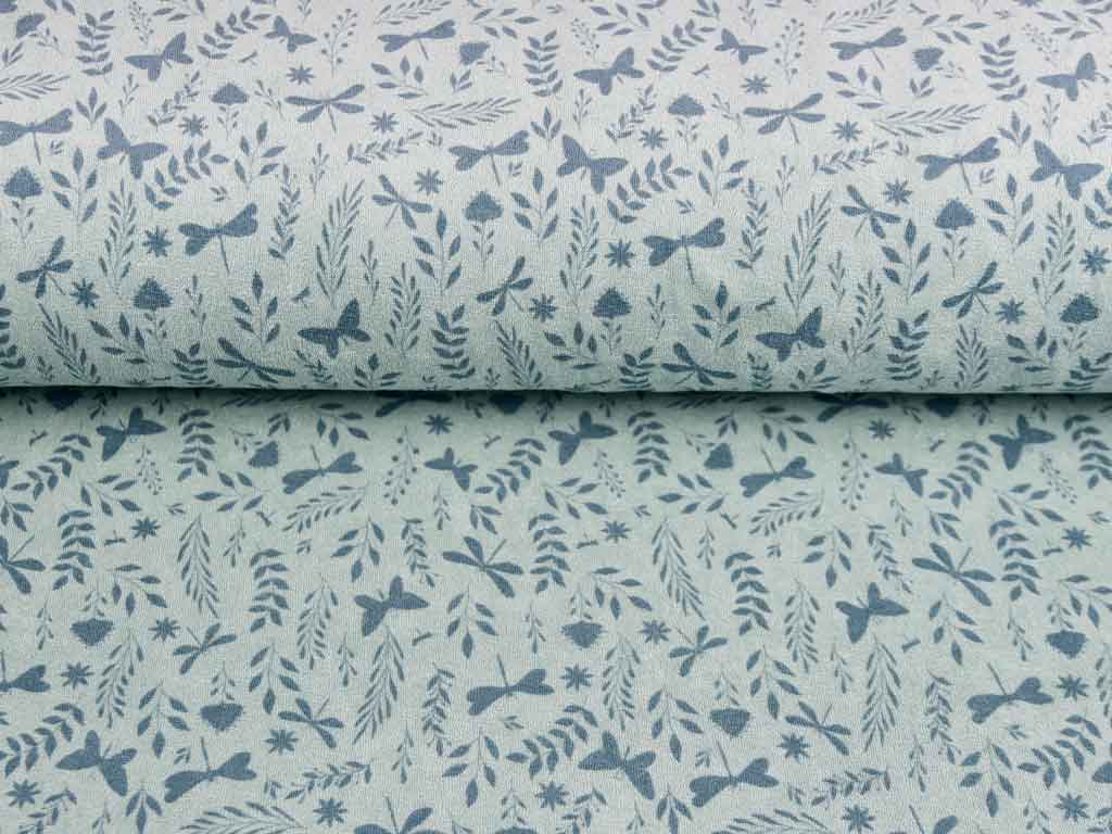 Ein elastischer, mintfarbener Frotteestoff (Sweat) mit altmintfarbenen Blumen, Schmetterlingen, Libellen und Zweigen. Er ist superbequem, weil er elastisch und kuschelig weich ist. Die Oberseite weist die typischen regelmäßigen Schlaufen auf, die Unterseite gleicht einem Sweatstoff.