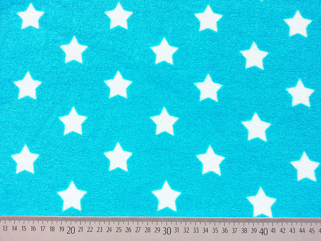 Ein weicher Sweat Frotteestoff in türkis mit weißen Sternen. Die Sterne sind 3,3 cm groß.