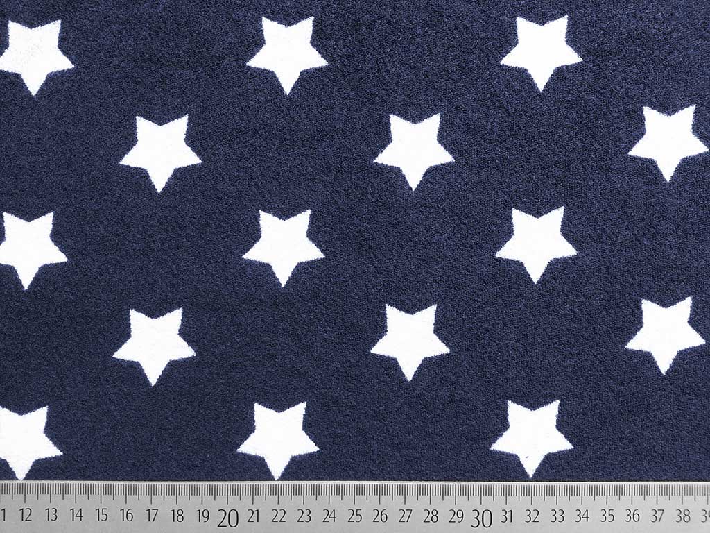 Ein weicher, dunkelblauer Sweat Frotteestoff mit weißen Sternen. Die Sterne sind 3,3 cm groß.