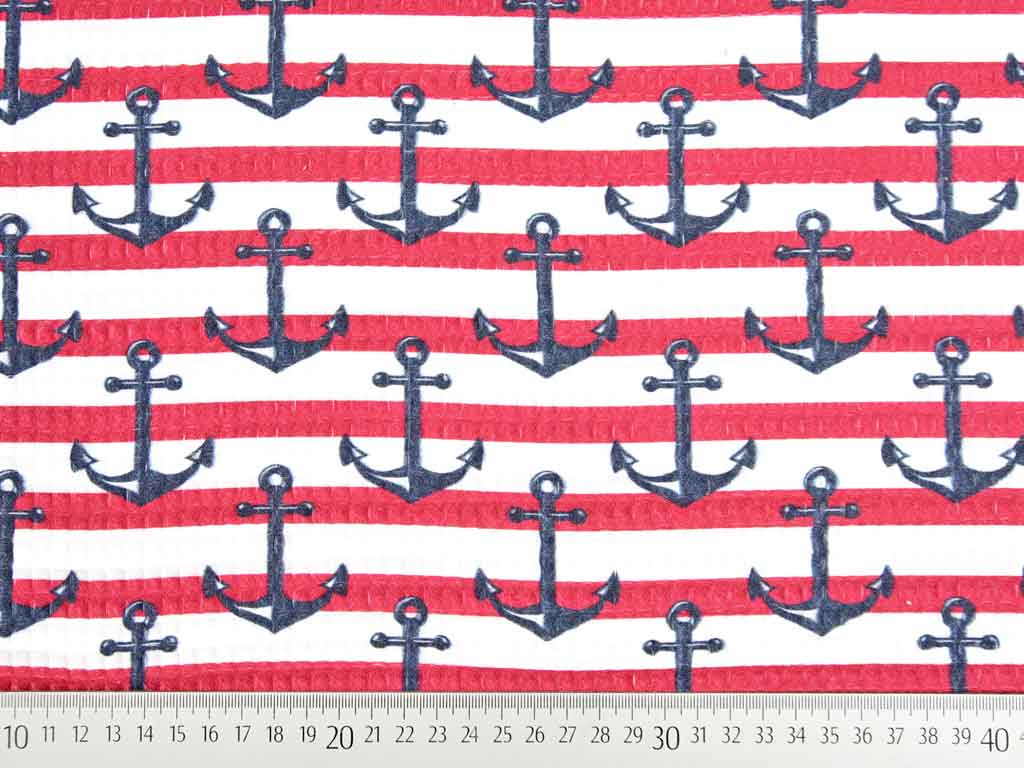 Ein weißer Waffelpiqué Stoff mit feiner Waffelstruktur bedruckt mit 1 cm breiten, roten Streifen und dunkelblauen Ankern. Die Anker sind ca. 5,5 cm groß. Das Waffelmuster der Vorder- und Rückseite sieht gleich aus.