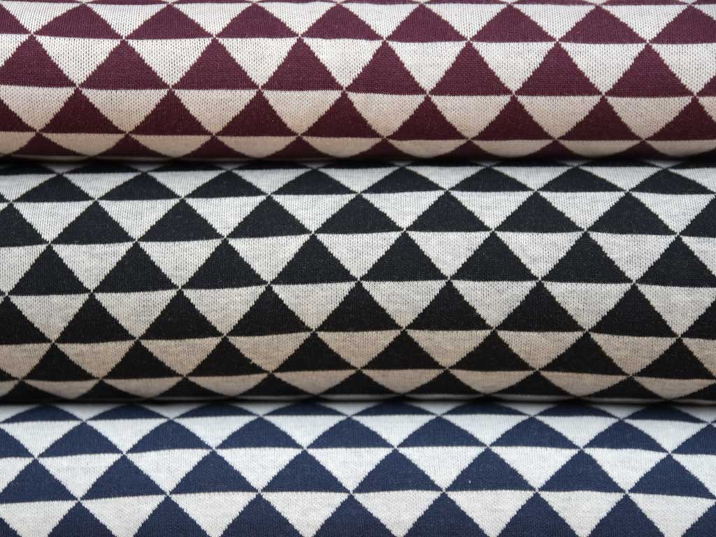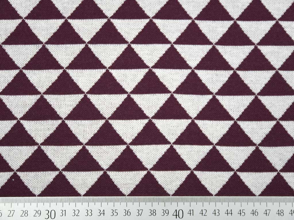 Ein hochwertiger angerauter Hamburger Liebe Bio 3-Farb-Jacquard-Jersey aus 100% Baumwolle (Bio) (hergestellt nach GOTS Richtlinien) mit Dreiecken in bordeaux (weinrot) und ecrue.