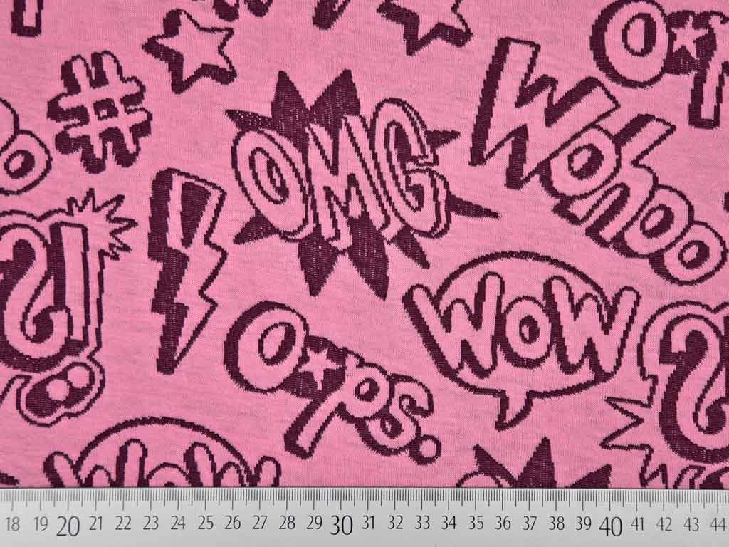 Aus der Hamburger Liebe Kollektion Pattern Love ein hochwertiger Jacquard Jersey in rosa mit weinroten Schriftzügen WOW, OMG und Oops hergestellt aus 100% kbA Bio Baumwolle nach GOTS Richtlinien.