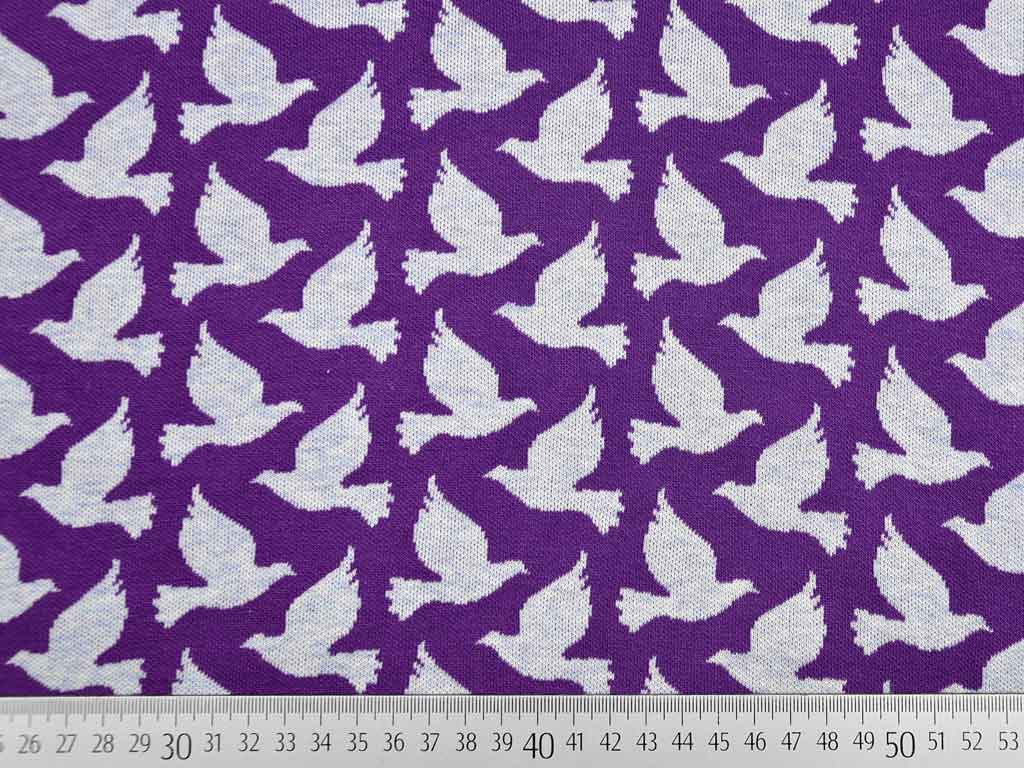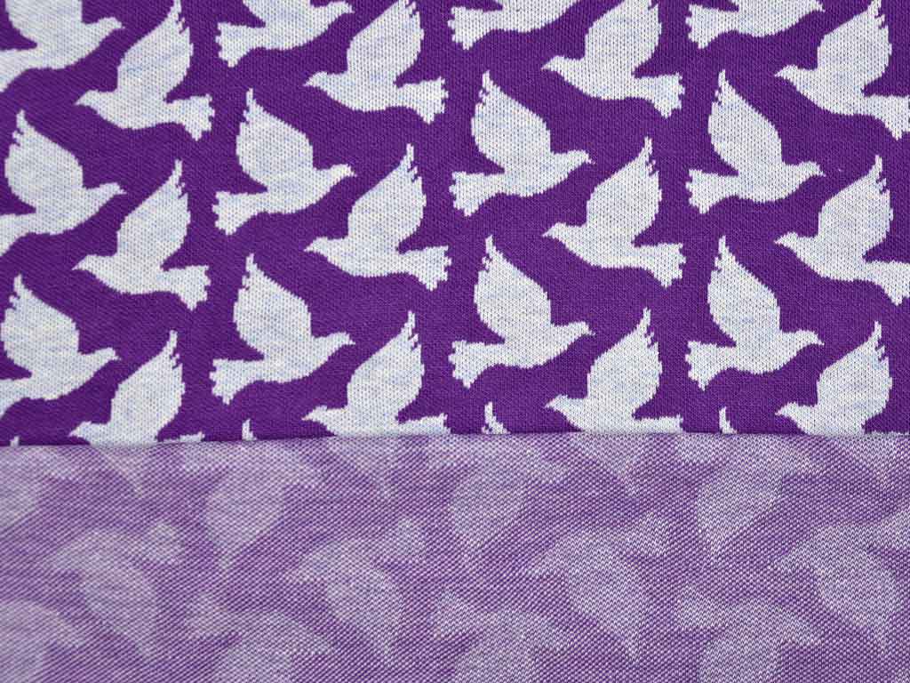 Hochwertiger Hamburger Liebe Mélange 2-Farb-Jacquard Jersey aus 100% kbA Bio Baumwolle (GOTS), hier mit wunderschönen Tauben in der Farbstellung lila weiß.
