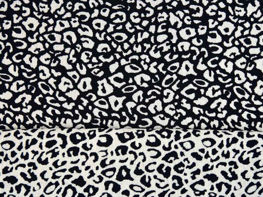 Ein längselastischer Doubleface Jacquardstoff in schwarz weiß (offwhite) mit Tiermuster. Der Stoff ist beidseitig verwendbar. Auf der Rückseite ist die Farbstellung genau anders herum.