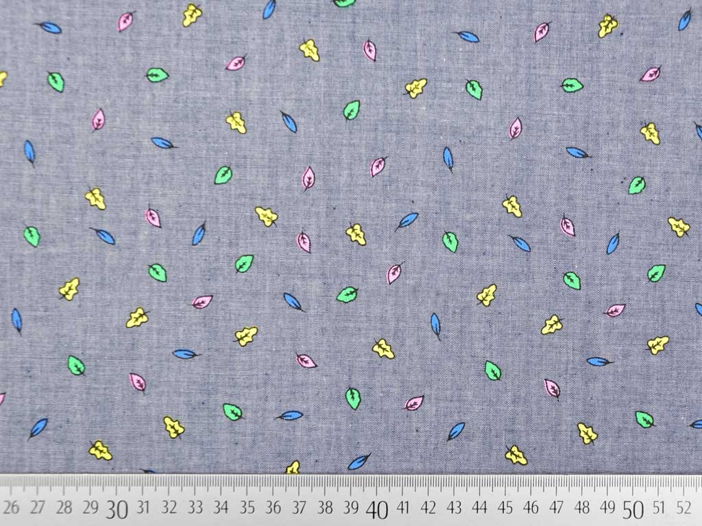 Ein wunderschöner, leichter Chambray in blau melange mit kleinen, bunten Blättern.