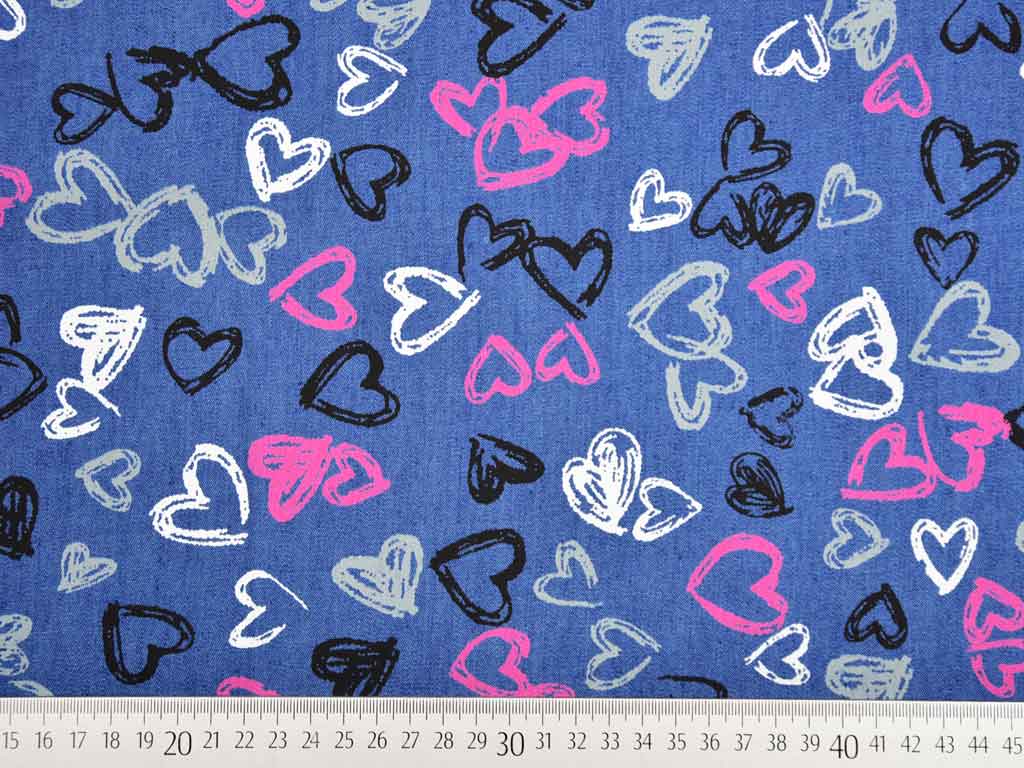 Ein leichter, blauer Jeansstoff mit gemalten Herzen in pink, grau, weiß und schwarz.