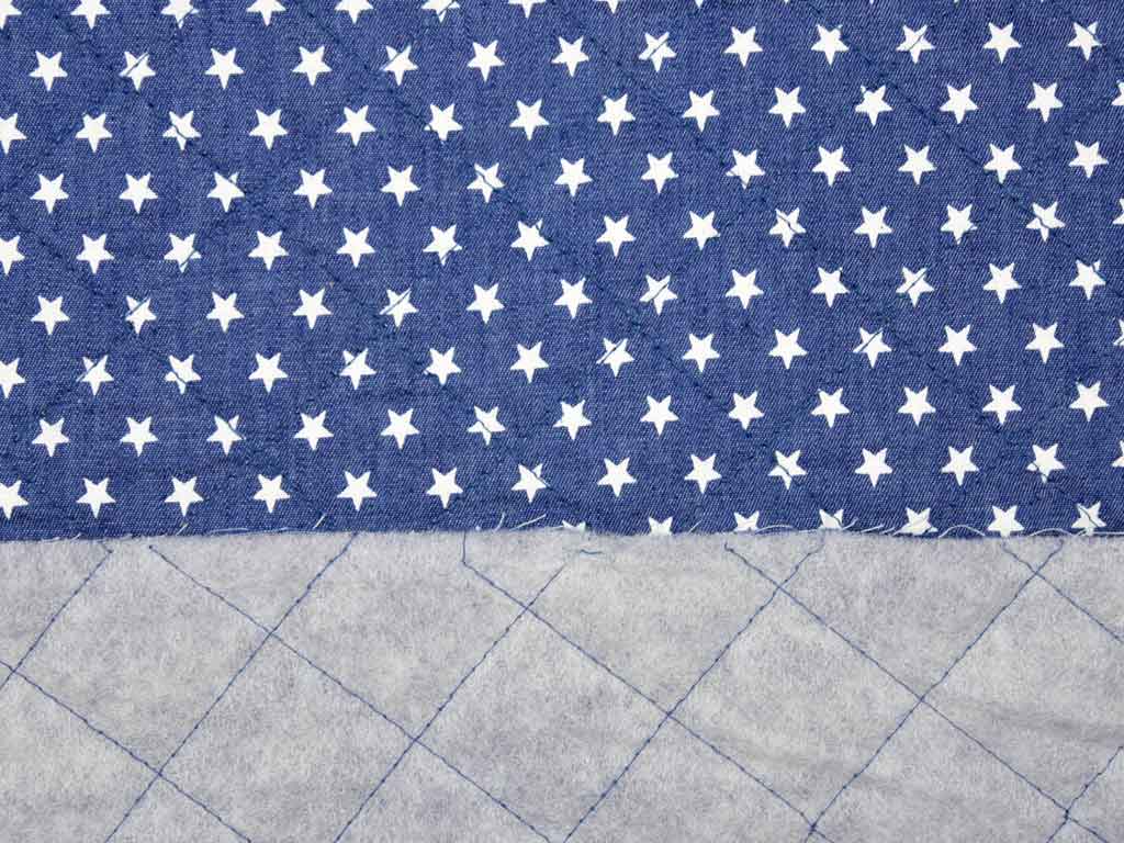 Ein toller gesteppter Jeansstoff in jeansblau mit kleinen Sternen (7mm) in weiß. Die gesteppten Rauten sind 5 cm groß.