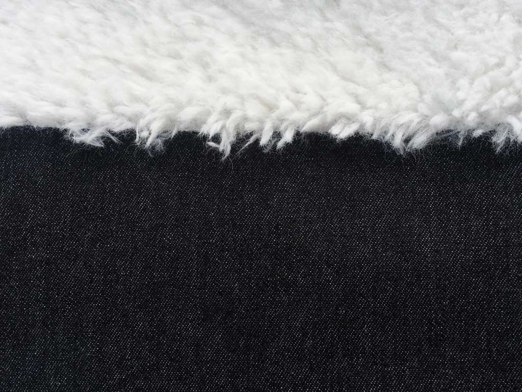 Ein cooler Doubleface aus schwarzem Jeansstoff und cremeweißem Teddyfleece (Schafsfell-Imitat). Das Teddyfleece ist super weich und flauschig.