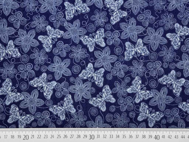 Ein weicher, dunkelblauer Stretch Jeansstoff mit weißen Blumen und Schmetterlingen. Durch den Elasthan Anteil dehnt er sich leicht und bietet somit einen guten Tragekomfort.