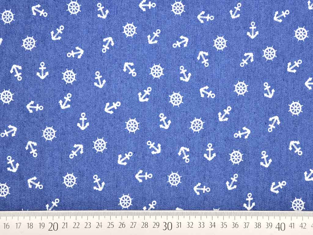 Ein weicher, jeansblauer Stretchjeansstoff bedruckt mit weißen Ankern und Steuerrädern. Durch den Elasthan Anteil dehnt er sich leicht und bietet somit einen guten Tragekomfort.