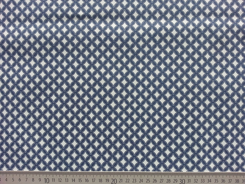 Ein jeansblauer Jeansstoff mit Gittermuster, das sich aus hellblauen Kreisen zusammensetzt. Durch den Elasthan Anteil dehnt er sich leicht und bietet somit einen guten Tragekomfort.