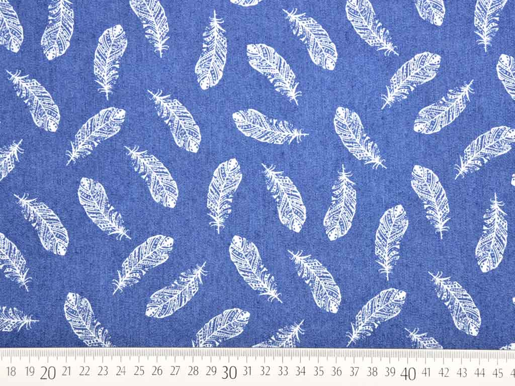 Ein weicher, jeansblauer Stretch Jeansstoff bedruckt mit weißen Federn. Durch den Elasthan Anteil dehnt er sich leicht und bietet somit einen guten Tragekomfort.