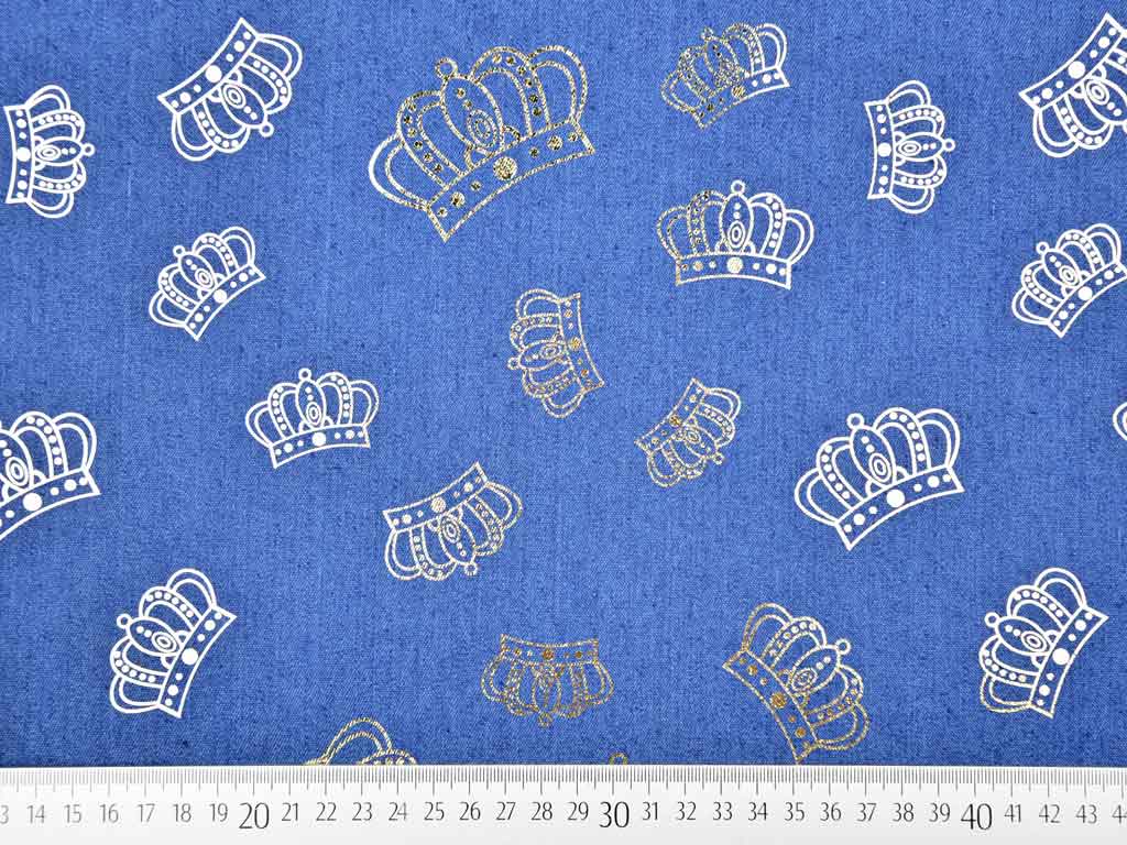 Ein elastischer Jeansstoff in jeansblau mit gold-metallic farbenen Kronen.