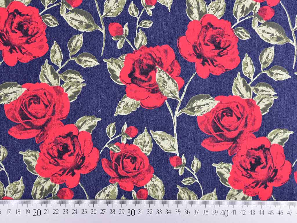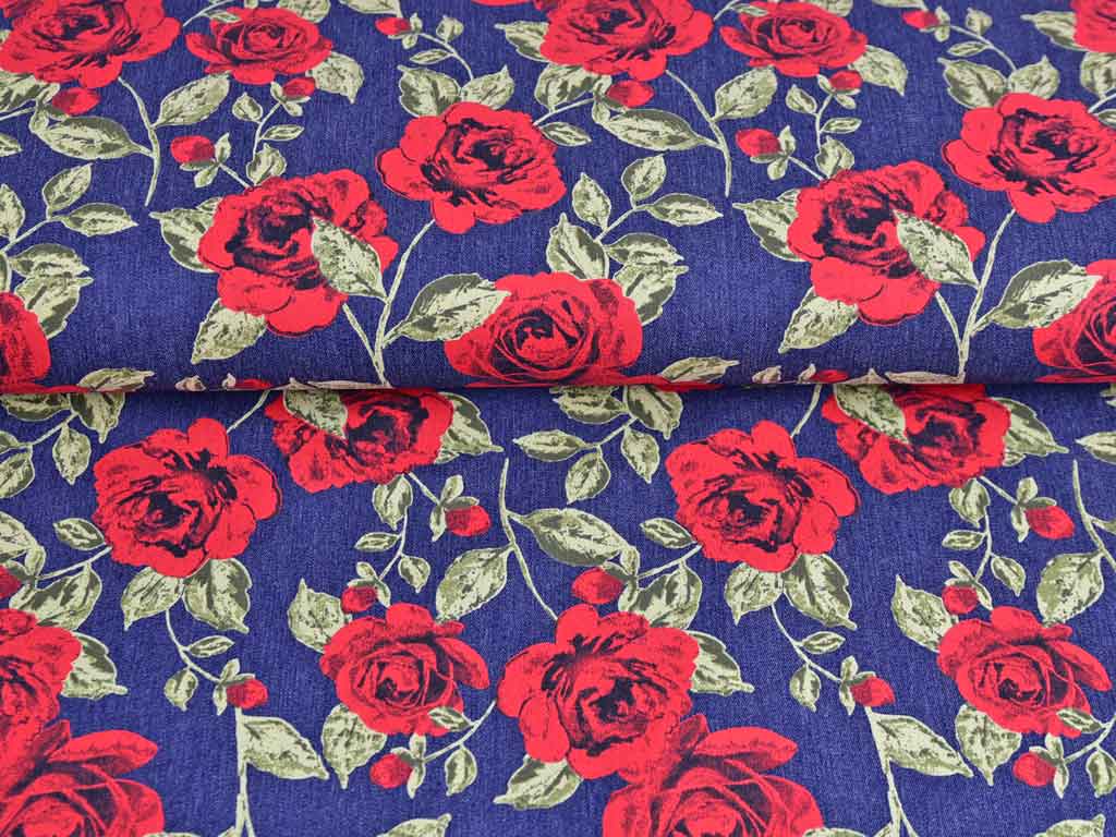 Ein weicher, dunkelblauer Stretchjeansstoff bedruckt mit roten Rosen. Die Rosen sind 7 cm lang und 7 cm breit. Durch den Elasthan Anteil dehnt sich der Jeansstoff leicht und bietet somit einen guten Tragekomfort.