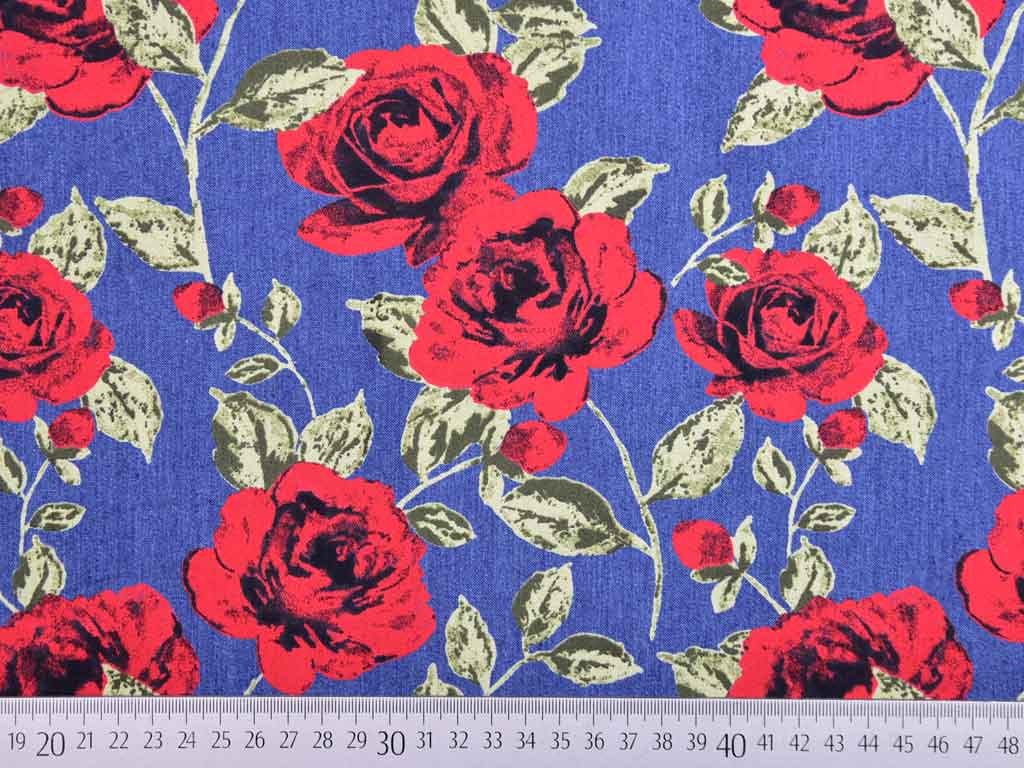 Ein weicher, jeansblauer Stretchjeansstoff bedruckt mit roten Rosen. Die Rosen sind 7 cm lang und 7 cm breit. Durch den Elasthan Anteil dehnt sich der Jeansstoff leicht und bietet somit einen guten Tragekomfort.