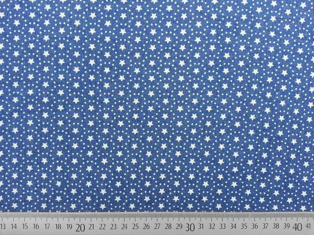Ein weicher und elastischer Stretch Denim in jeansblau mit weißen Sternen (ca.0,5cm) und Punkten (ca.0,2cm), die als Kreis um den Stern angeordnet sind.