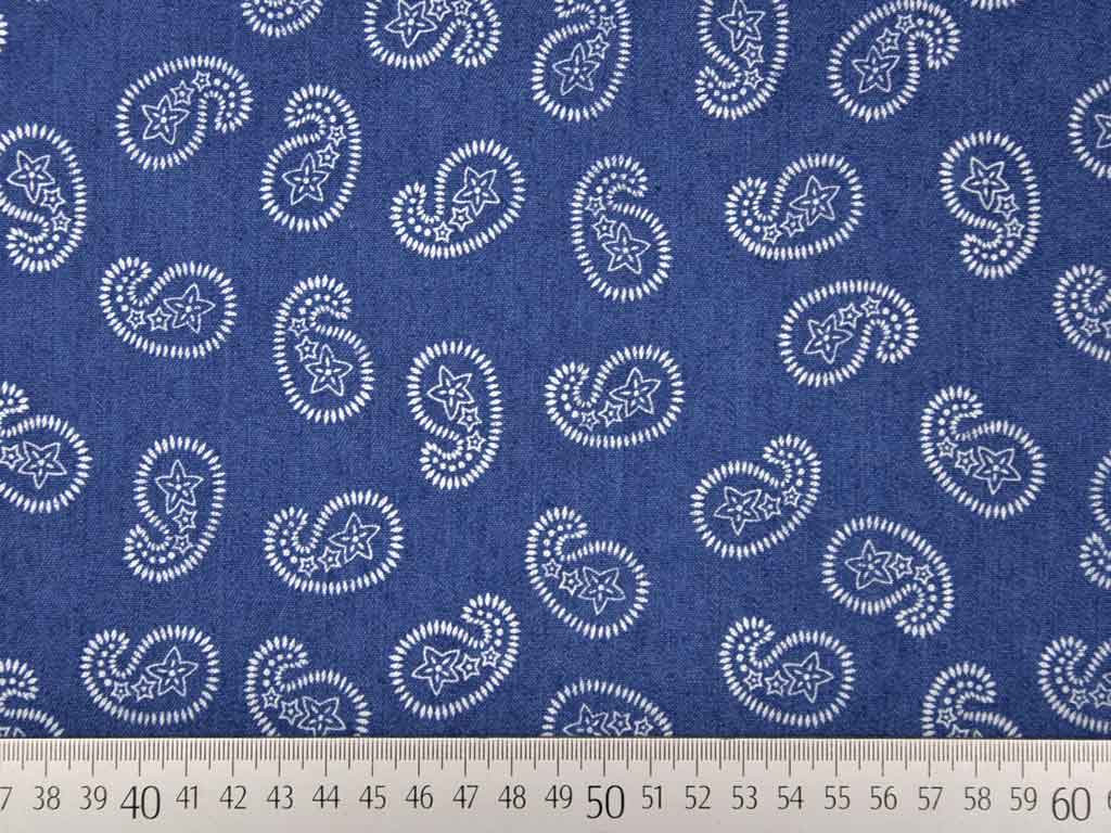 Ein weicher, jeansblauer Jeansstoff mit Stretch und weißem Paisley Muster.
