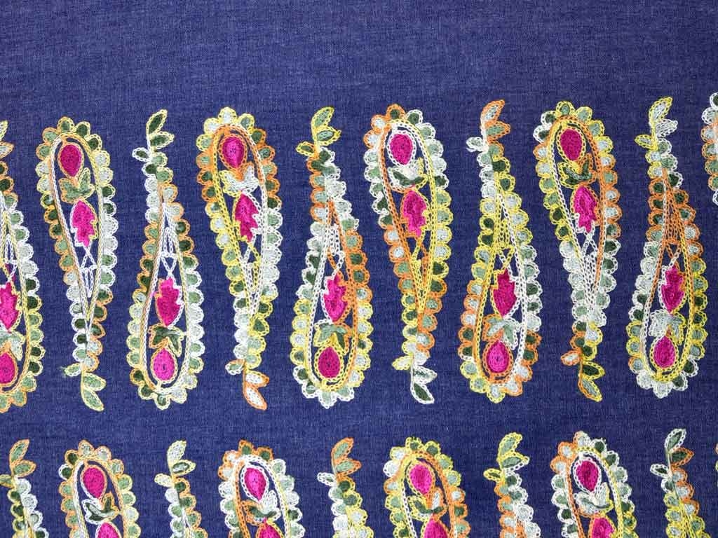 Ein leichter, dunkelblauer Jeansstoff mit bestickter Bordüre als Paisleymuster in gelb, pink, orange und grün.