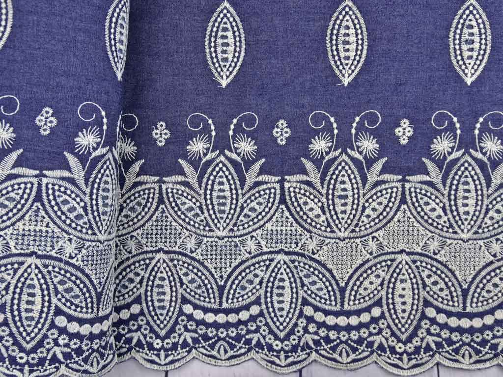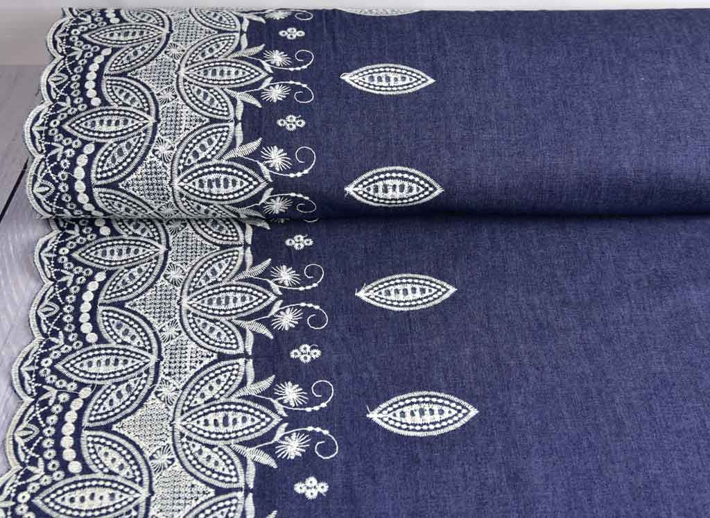 Ein weicher, dunkelblauer Jeansstoff (Chambray ähnlich) aus 100% Baumwollemit gestickter Bogenkante als weißem Blättermuster an der unteren Webkante. Die gestickte Bogenkante verläuft entlang der einen Webkante und ist zwischen 20 cm und 29 cm hoch, der Rest der Stoffbreite ist einfarbiger Jeansstoff.