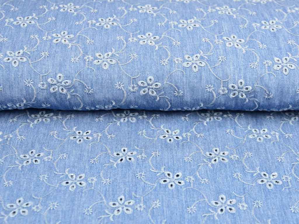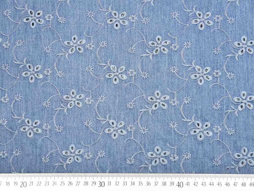 Ein leichter jeansblauer Jeansstoff mit gestickten Lochblumen und Ranken.