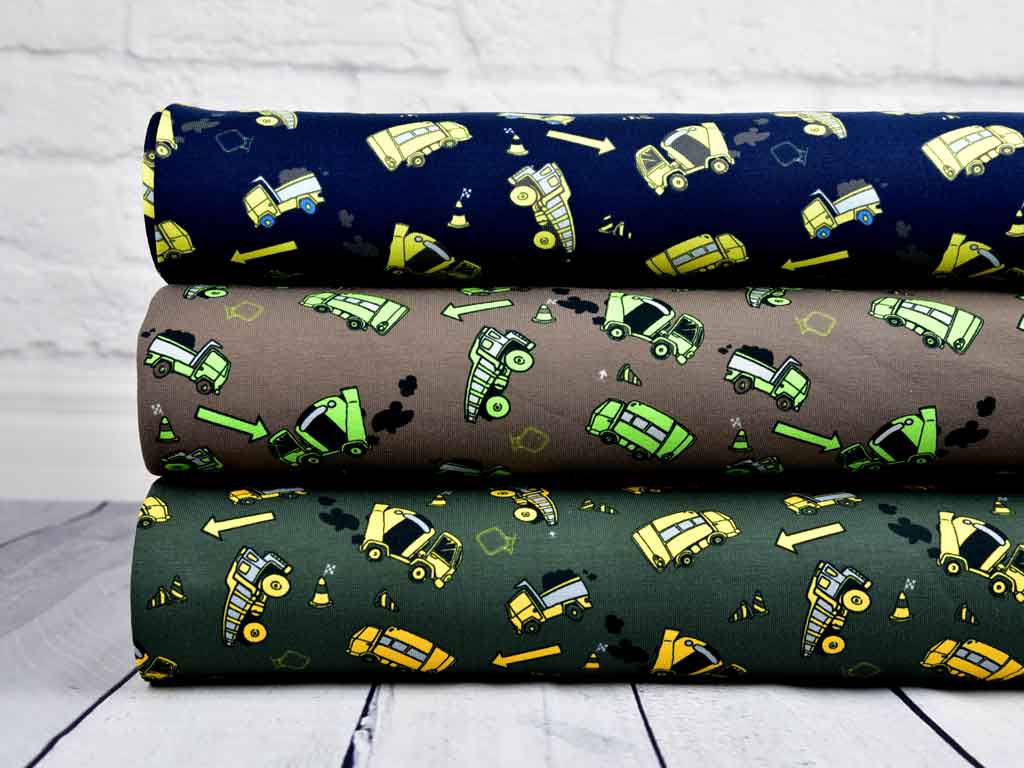 Ein toller Jersey in grün mit verschiedenen Baustellenfahrzeugen wie z.B. Bagger und LKW. Die Fahrzeuge sind in gelb und schwarz gehalten.
