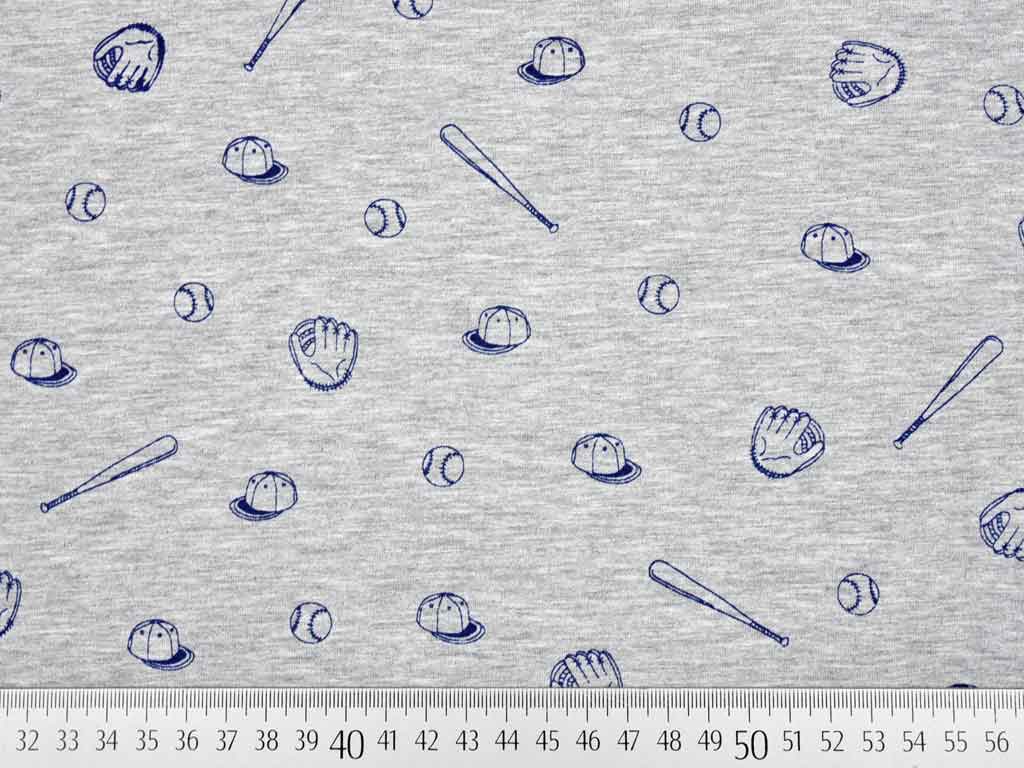 Ein weicher Jersey in trendigem Grau melange mit dunkelblauen Baseball Schlägern, Bällen und Baseball Cappys.