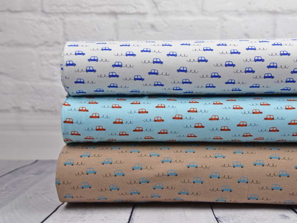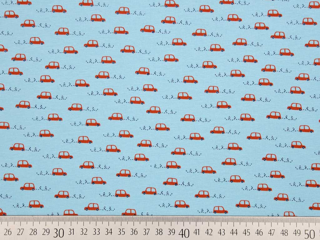 Ein weicher Jersey in hellblau mit rostbraunen Autos.
