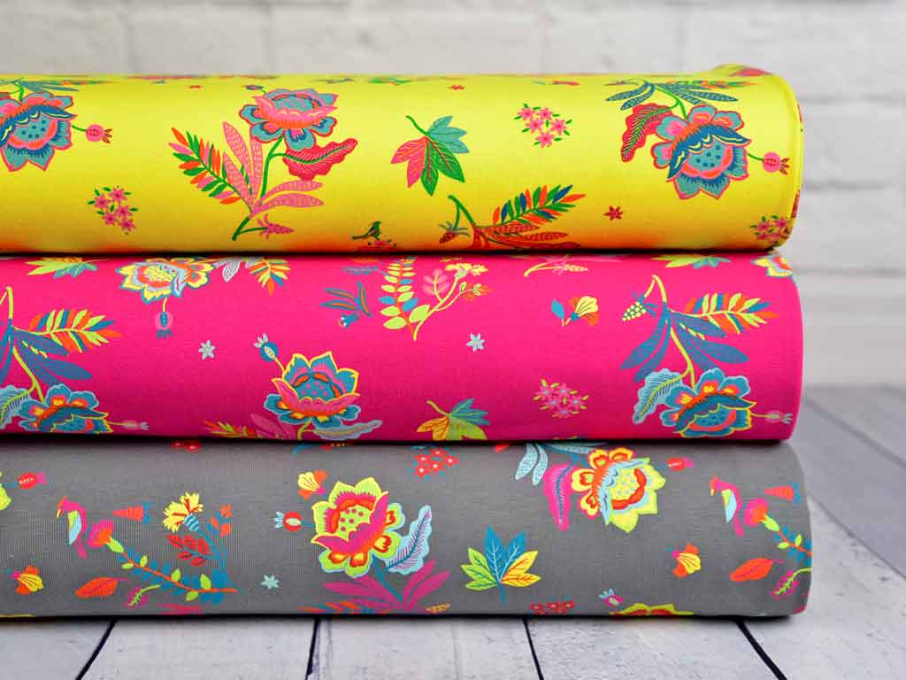 Ein weicher, gelber Baumwolljersey mit bunten Sommerblumen, Blättern und kleinen Vögeln in pink, rot, grün, petrol, mint und rosa.