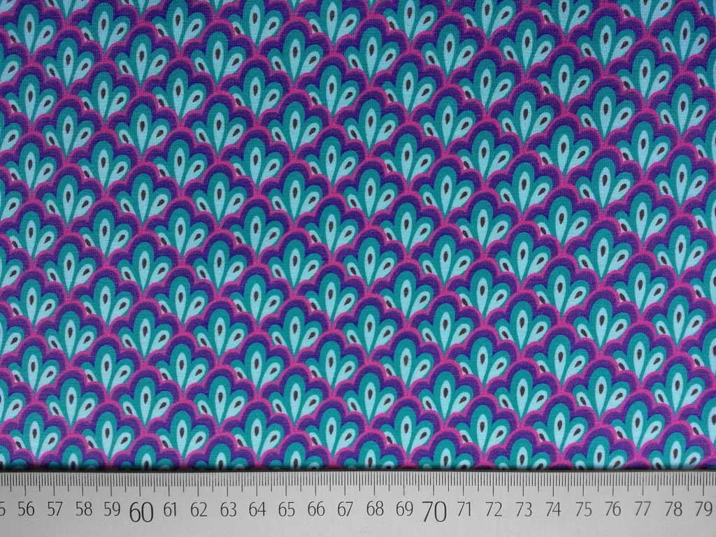 Ein wunderschöner Jersey (Cover Me) von Hamburger Liebe aus der Serie Eden mit Fächermuster in u.a. lilablau, petrol, helltürkis und dunkelpink.