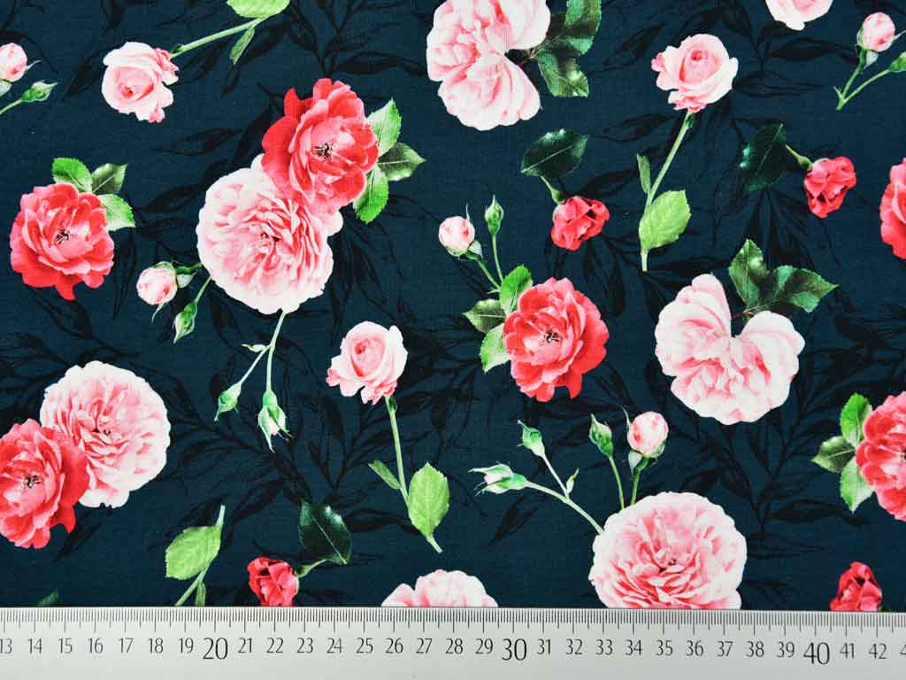 Ein dunkelblauer Baumwolljersey als Digitaldruck mit rosa und pinken Pfingstrosen und Knospen. Dieser Digitaldruck besticht durch seine Farbbrillianz und weichen Griff.