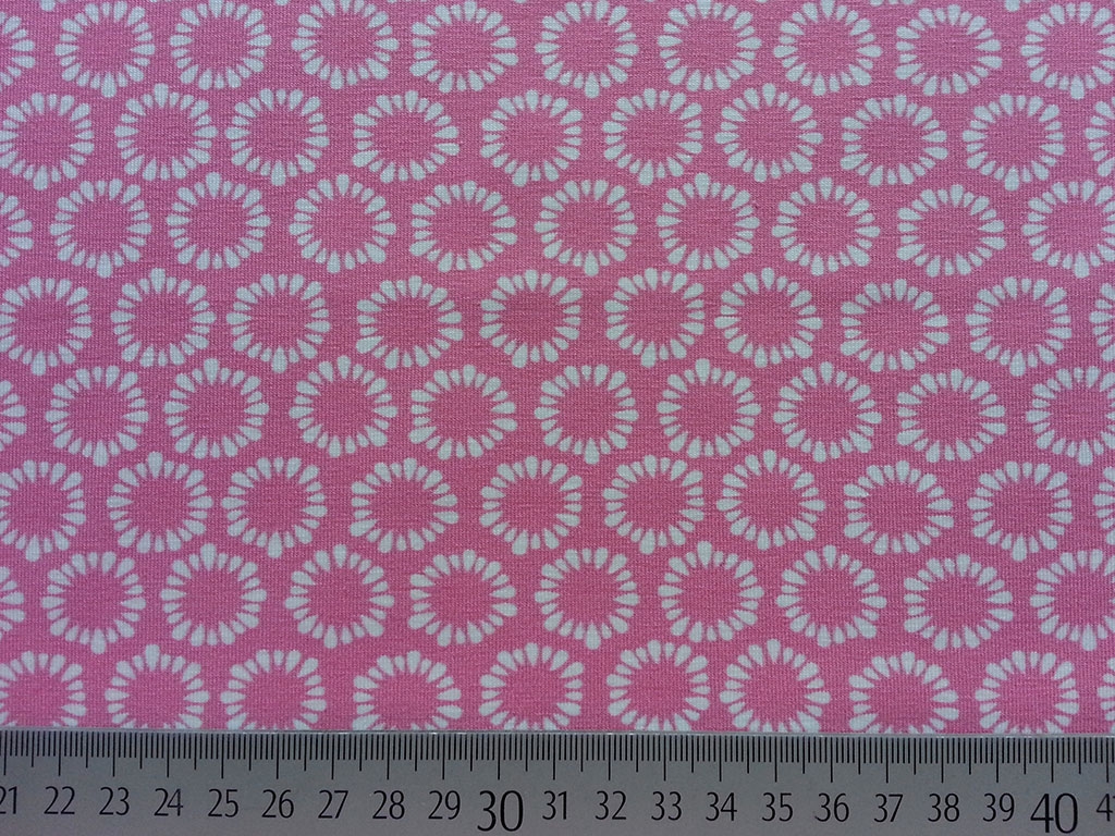 Ein rosa Jerseystoff mit weißem Rädchenmuster mit dem Namen "Ringadingdong" aus der Serie Sweet Life von Hamburger Liebe. Produziert von Hilco in bekannt hochwertiger Qualität.