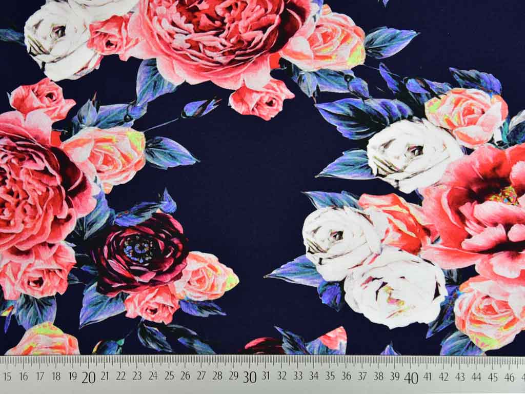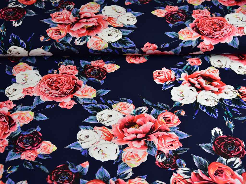 Ein weicher, dunkelblauer Baumwolljersey als Digitaldruck mit großen, roten und weißen Rosen und hellblauen Blättern . Dieser Digitaldruck besticht durch seine Farbbrillianz.
