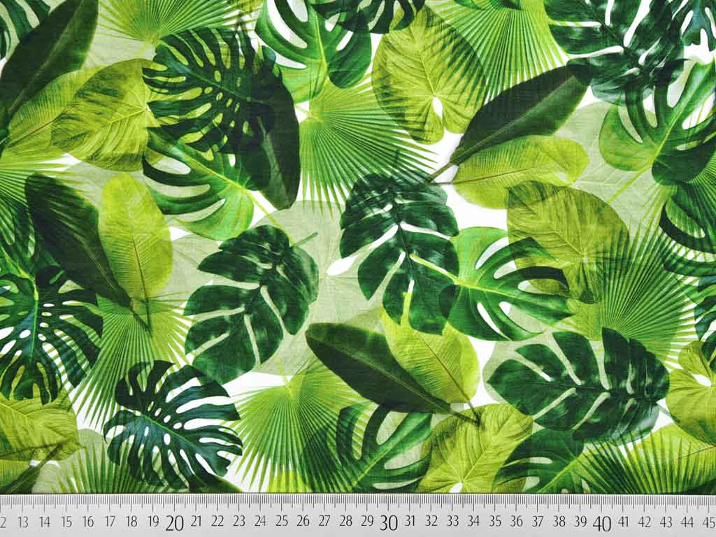 Ein weicher Baumwolljersey als Digitaldruck mit hochbrillianten Farben hier mit sattgrünen Palmblättern.