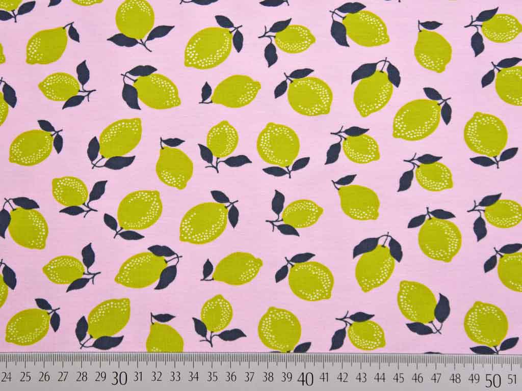 Ein weicher Baumwolljersey in rosa mit gelbgrünen Zitronen bzw. Limonen.