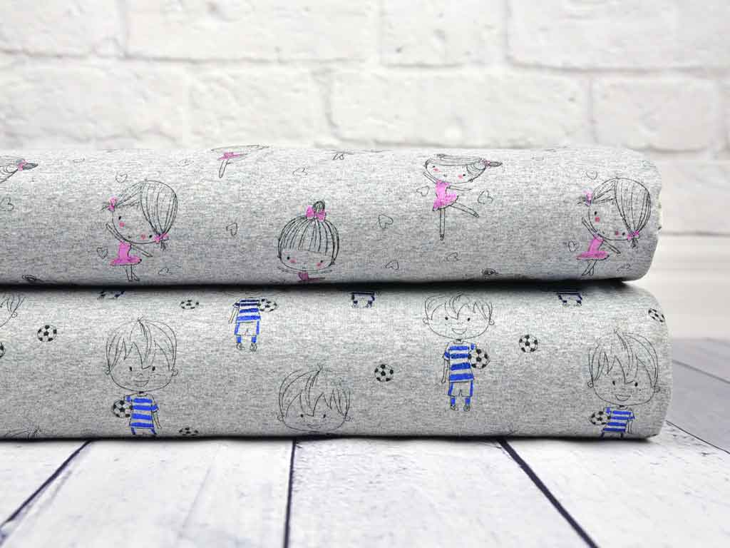 Ein weicher, grau-melierter Jersey mit kindlichen Fußballern und schwarz-weißen Fußbällen. Die blauen Streifen des Trikots sind blau-metallic.