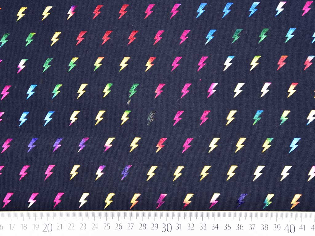 Ein dunkelblauer Jersey mit kleinen Blitzen in bunt metallic als Foliendruck. Die Blitze sind 1,5 cm groß.