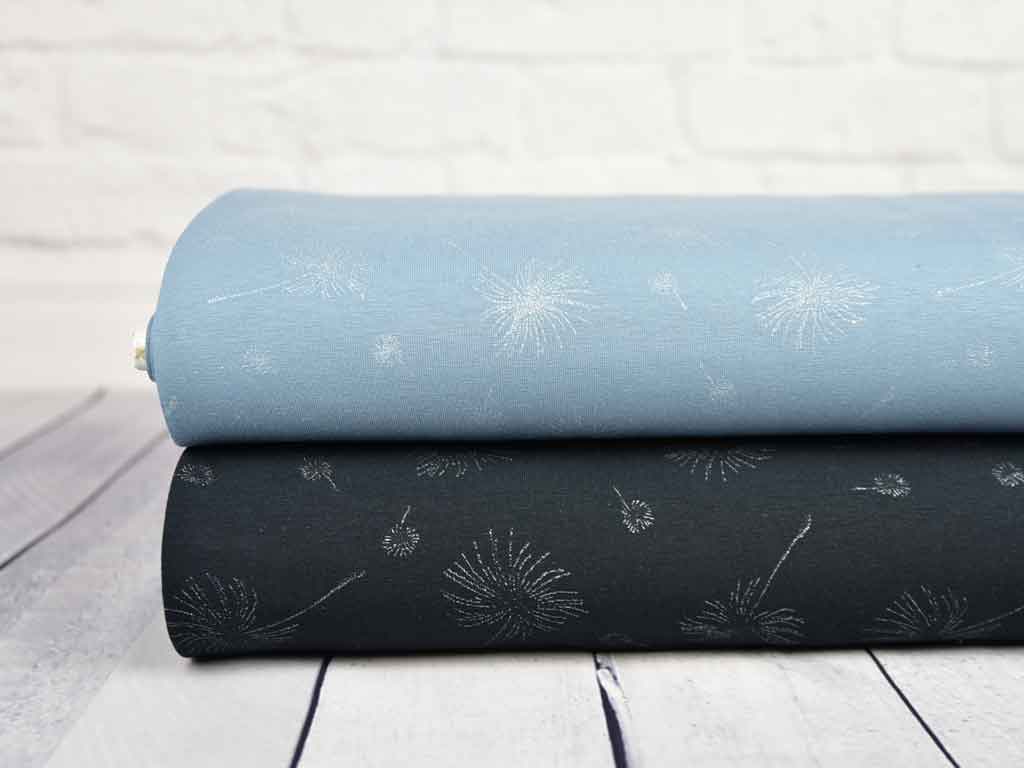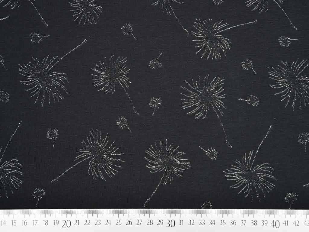Ein weicher, dunkelgrauer Jersey mit sehr zarten, silber glitzernden Pusteblumen. Die Pusteblumen erinnern an die Fontänen eines Feuerwerks.