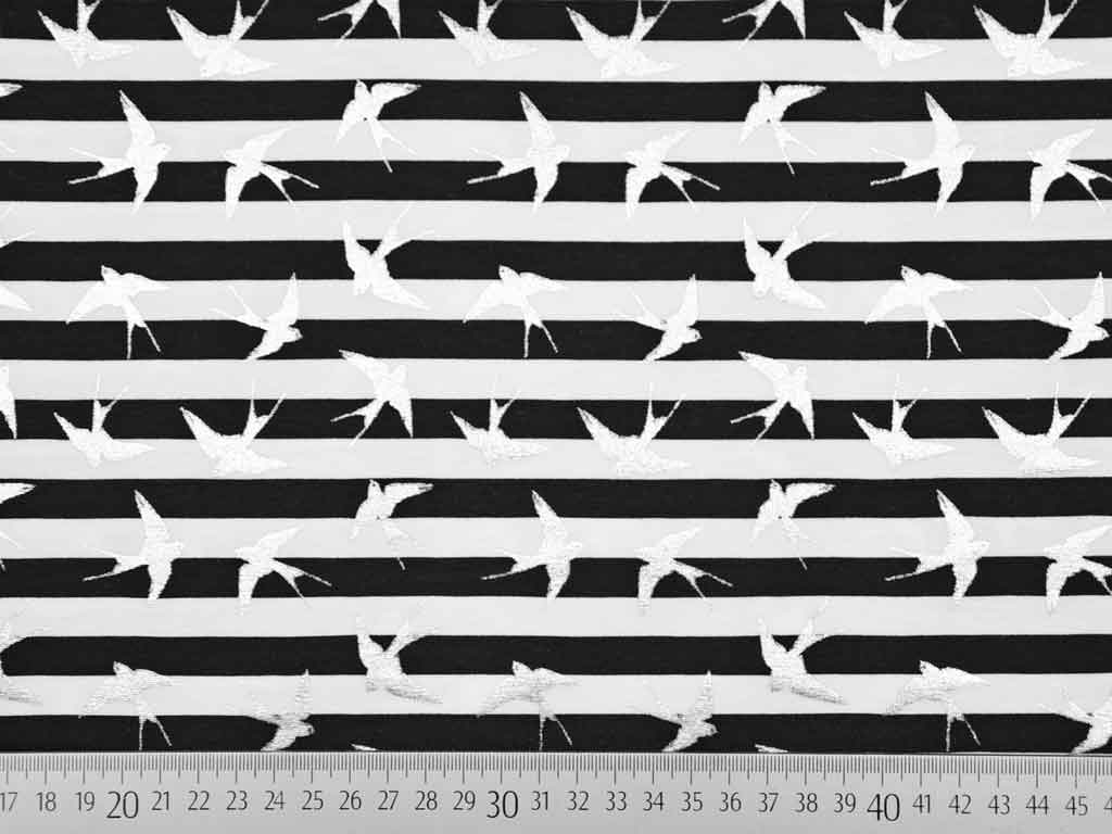 Ein weicher Baumwolljersey mit schwarzen und weißen Streifen bedruckt mit silberfarbigen Schwalben im Metallic Look. Die Streifen sind 1 cm breit.