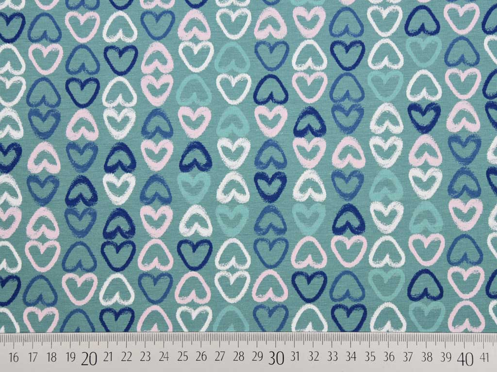Ein weicher Baumwolljersey in dunklem mint mit Herzen in rosa, jeansblau, dunkelblau, mint und weiß, die aussehen als wären sie mit Kreide aufgemalt.