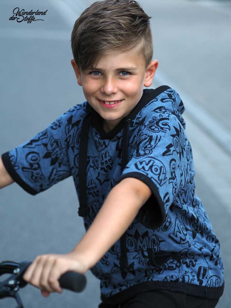 Aus der Hamburger Liebe Kollektion Pattern Love ein hochwertiger Jacquard Jersey in jeansblau mit dunkelblauen Schriftzügen WOW, OMG und Oops hergestellt aus 100% kbA Bio Baumwolle nach GOTS Richtlinien.