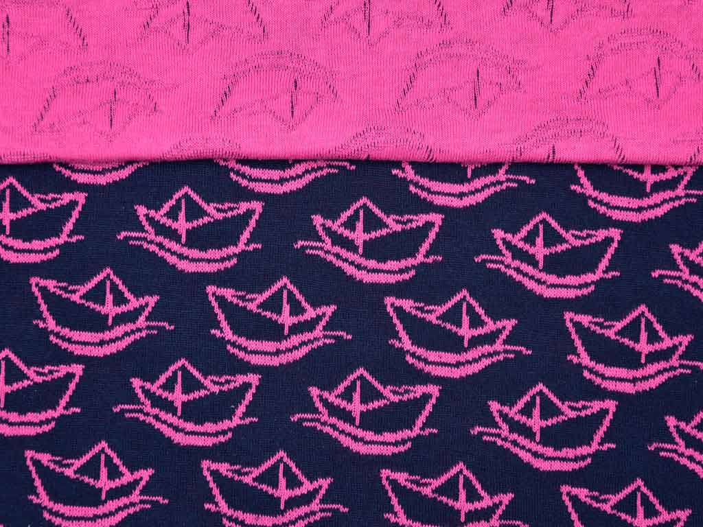 Hochwertiger Hamburger Liebe Bio Doubleface-Jacquard-Jersey aus 100% kbA Baumwolle (Bio)(hergestellt nach GOTS) in dunkelblau mit pink-farbenen Papierschiffchen. Grenzen Sie sich mit der seltenen Cloqué-Oberfläche und tollen Hamburger Liebe Designs von der Flut der Druckstoffe ab!