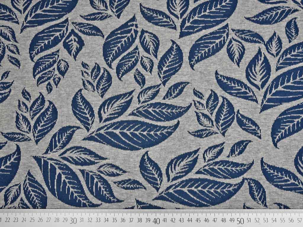Ein weicher elastischer Jacquard Jersey in hellgrau mit dunkelblauen Blättern.