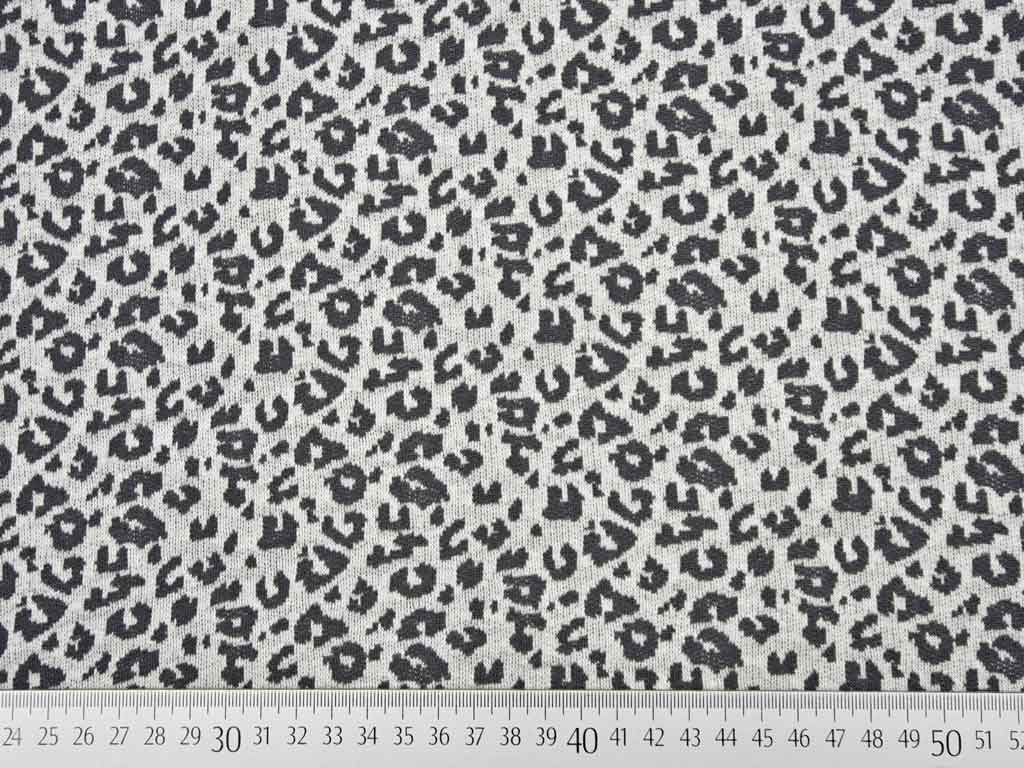 Ein leichter, weich fallender Jacquard Strickjersey in hellgrau mit dunkelgrauem Leoparden Muster.
