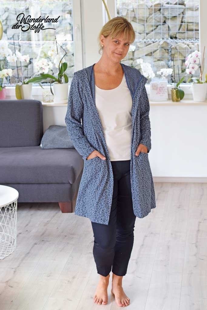 Ein leichter, weich fallender Jacquard Strickjersey in jeansblau mit dunkelblauem Leoparden Muster.