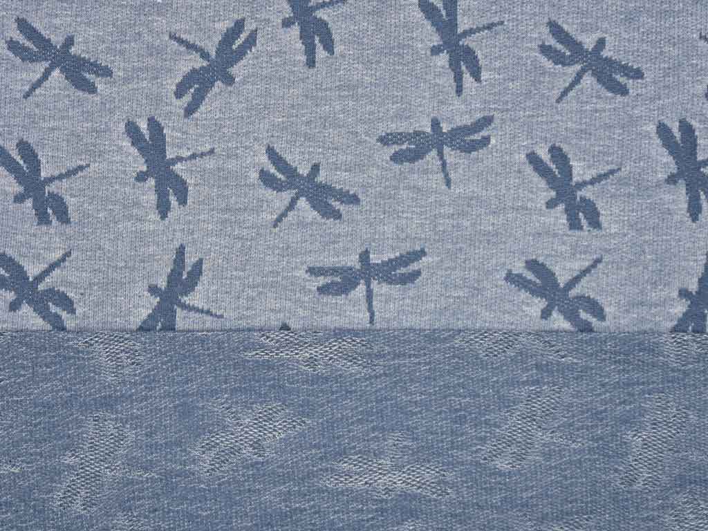 Ein leichter, weich fallender Jacquard Strickjersey in jeansblau mit dunkelblauen Libellen.