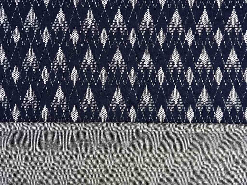 Ein dunkelblauer elastischer Jacquard Jersey mit gemusterten, weißen Rauten.