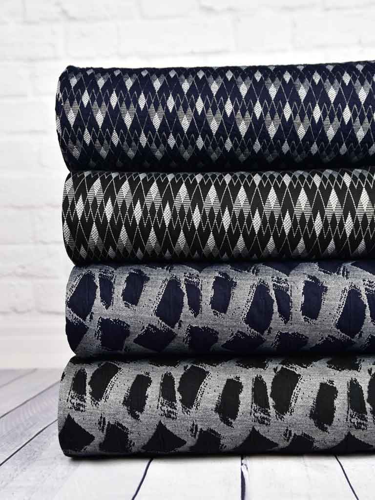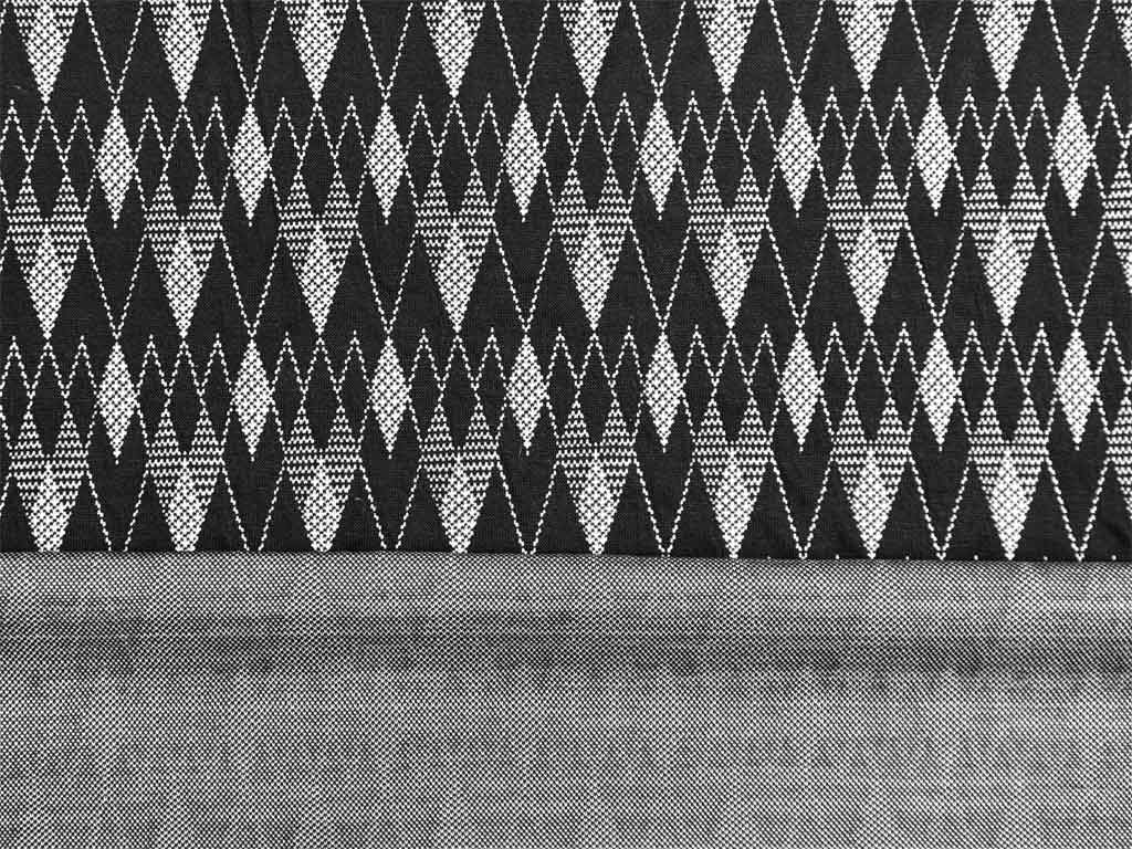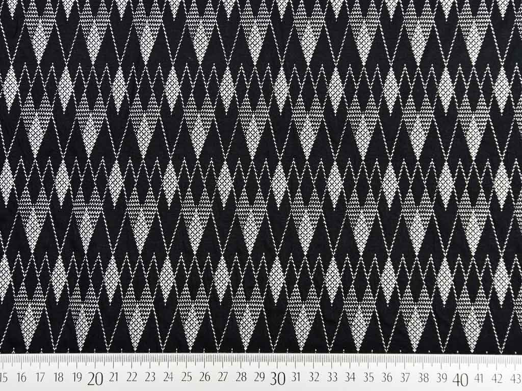 Ein schwarzer elastischer Jacquard Jersey mit gemusterten, weißen Rauten.