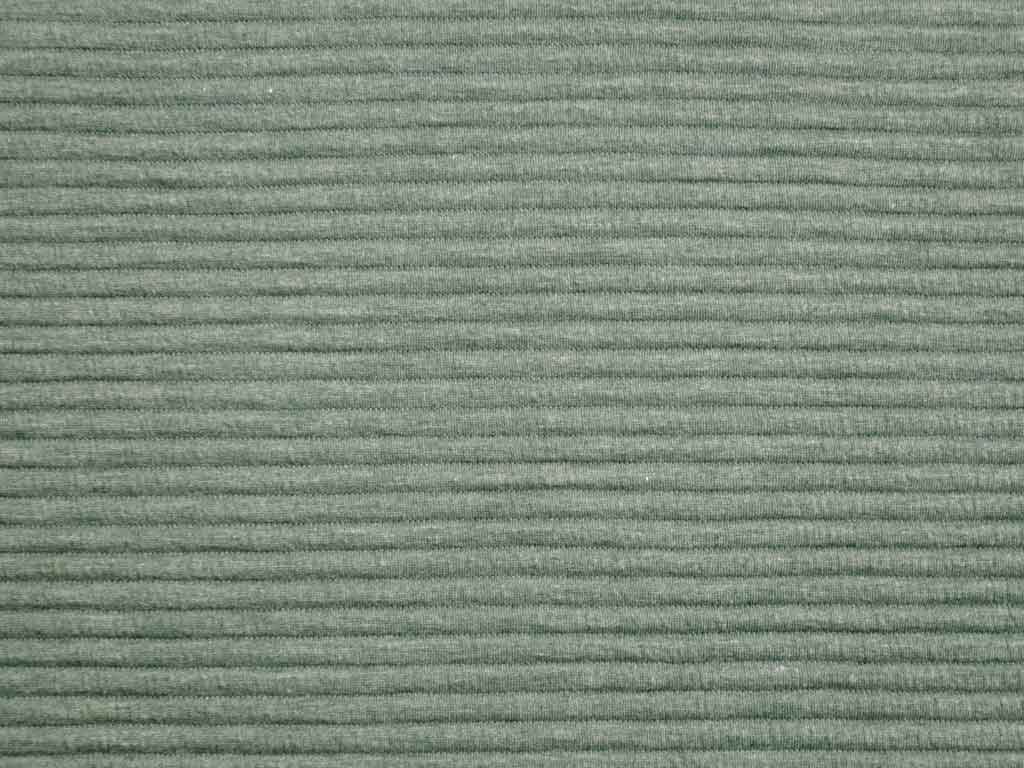 Ein weicher leicht elastischer Jacquard Jersey in khaki melange mit horizontalen Streifen. Durch Absteppen zweier Stofflagen entstehen die Streifen und es ergibt sich eine reliefartige 3D-Struktur. Die Rückseite ist in dunklerem Khaki.
